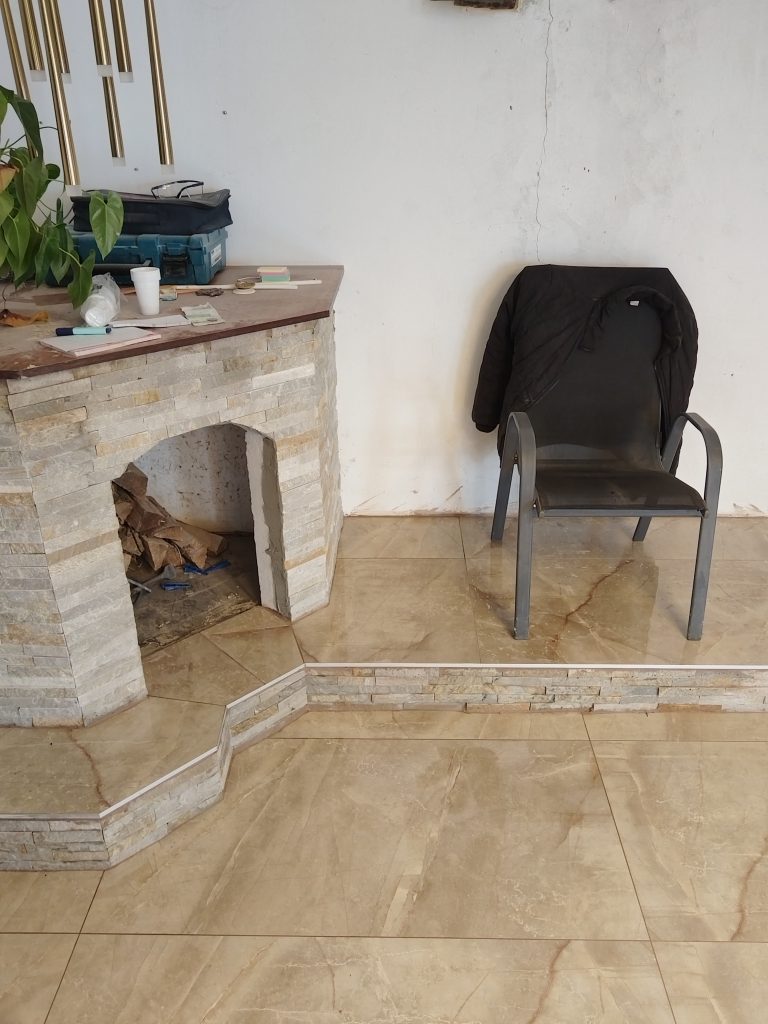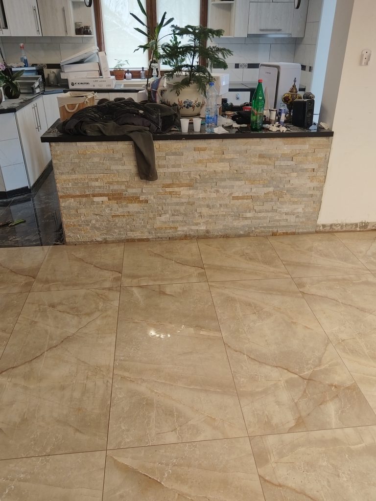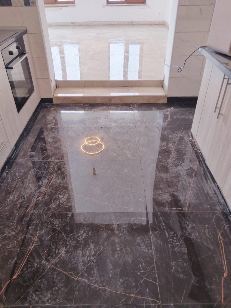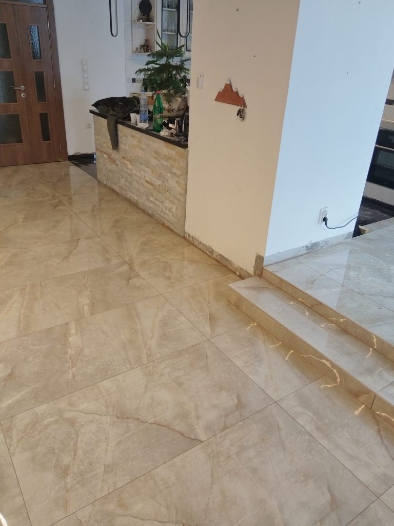 Postavljena keramika u dnevnoj sobi i trpezariji u 2 nivoa sa stepenikom, u sklopu je takodje uradjen i pod u kuhinji drugim dezenom keramike.