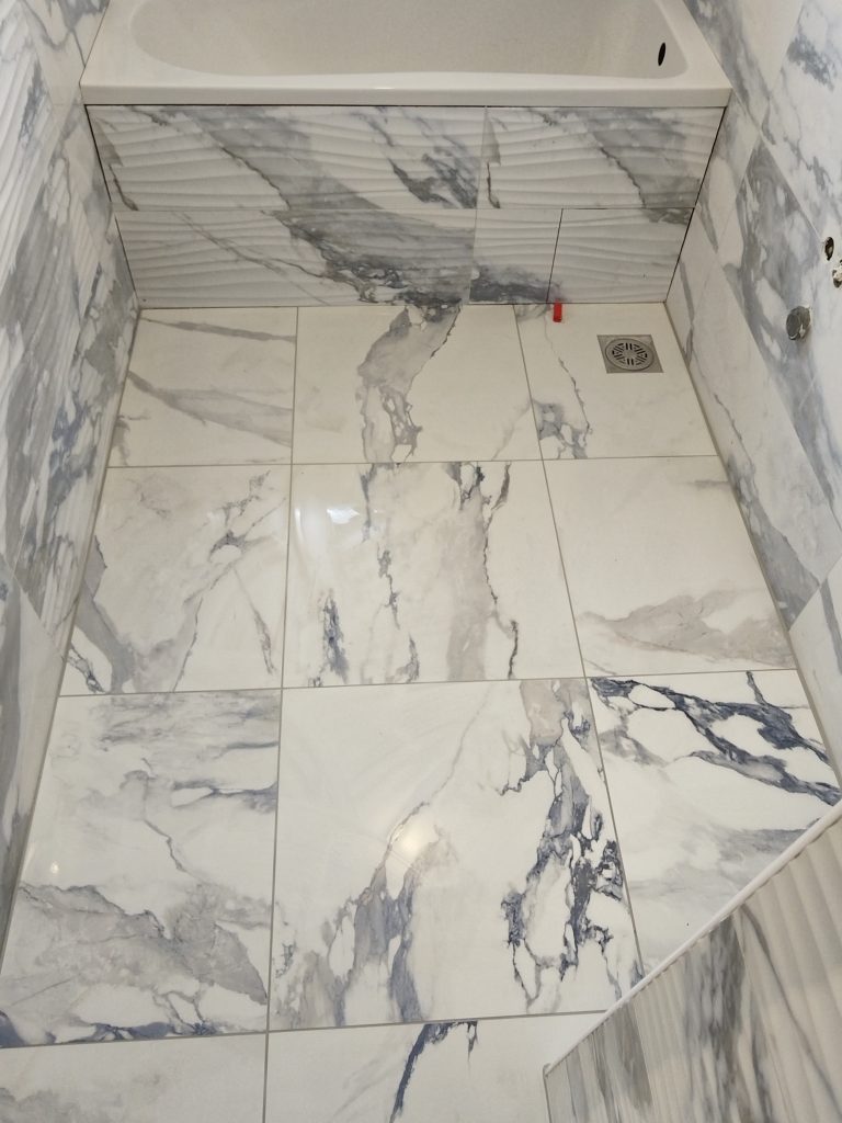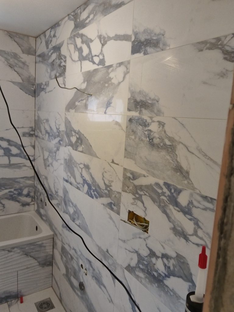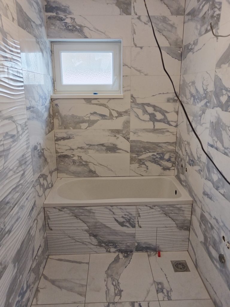 Uradjeno je keramikom dekorativnog dezena kombinacije plave sive i bele boje što ga čini izuzetno prostranim i svetlim. Takodje su pločice lake za održavanje i veoma praktične.